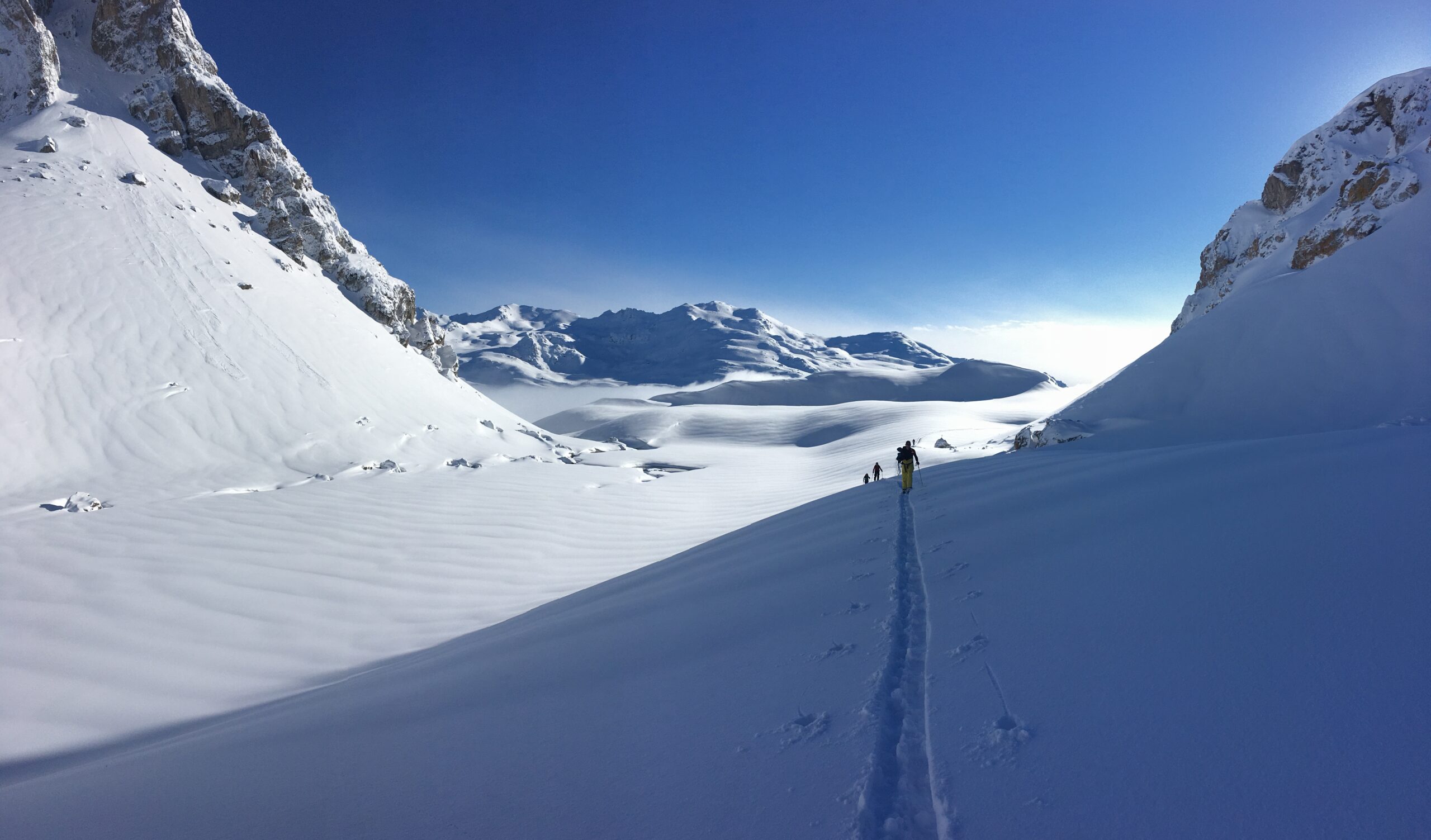 Nos itinéraires s’adressent aux passionnés de montagne, en ski ou splitboard. Des séjours variés mènent des terrains accessibles du Goléon / pic du mas de la Grave aux grandes courses de ski alpinisme comme le tour de la Meije, le tour de la Grande Ruine ou la traversée Écrins–Agneaux. Les refuges emblématiques (Promontoire, Adèle Planchard, Aigle…) offrent des haltes chaleureuses au cœur de paysages spectaculaires. Depuis le Lautaret, Arsine, le Pont de l’Alpe ou les hameaux de la Grave, chaque départ conduit vers des glaciers et cols mythiques : Glacier de l’Homme, tabuchet, Col de Casse déserte, Serret du Savon… Entre montées en peaux de phoques et descentes en liberté, l’expérience mêle isolement, panoramas grandioses et sensations intenses.