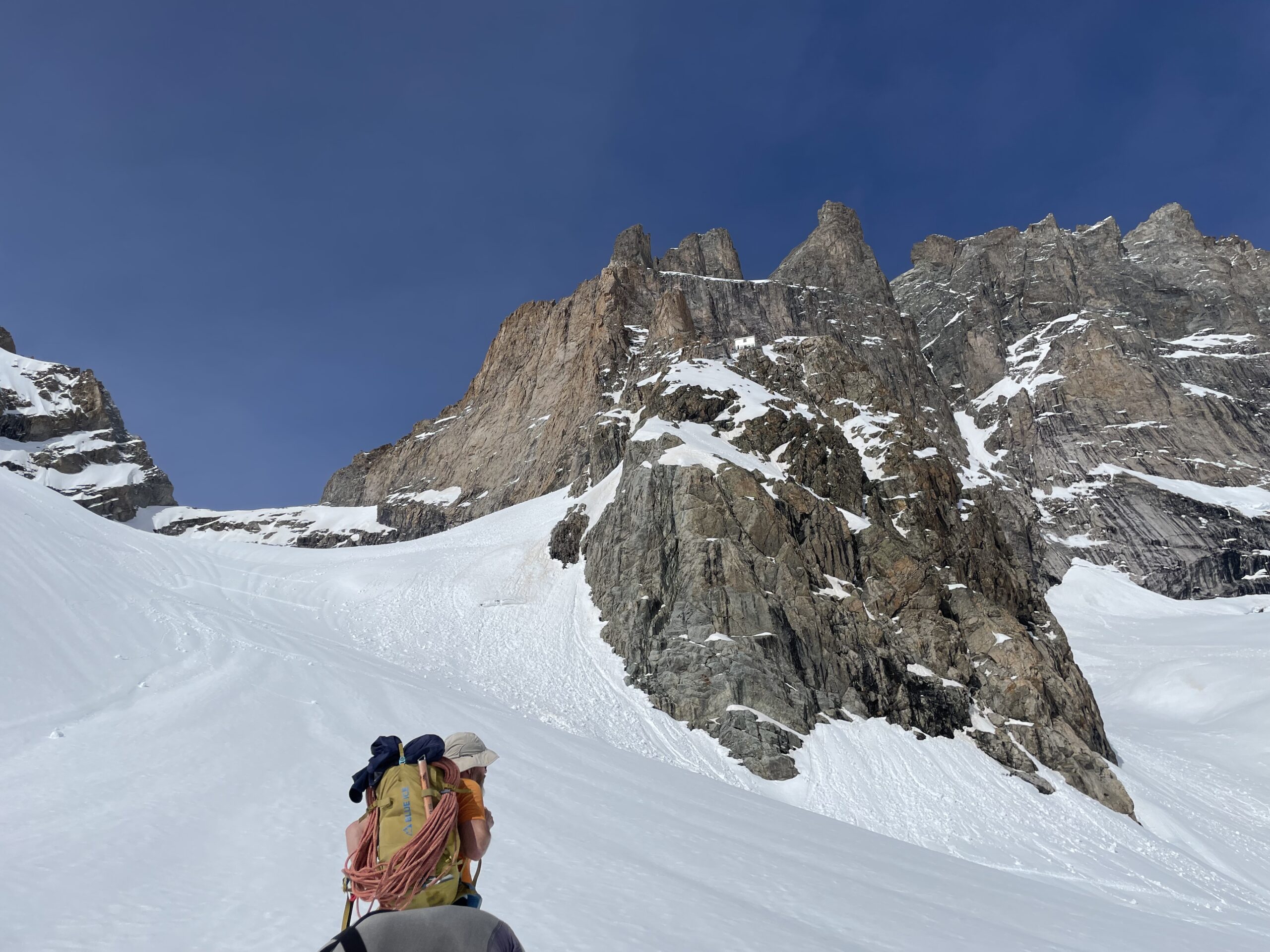 Le premier jour, nous gagnons le sommet du Dôme de la Lauze à 3 568 mètres par le téléphérique de La Grave et le téléski du glacier de la Girose. Une première très belle descente de 1 000 mètres de dénivelé nous dépose sur le glacier de la Selle, puis nous remontons et traversons à peaux de phoque son plateau supérieur pour atteindre la brèche du Râteau (3 235 m). De là, un raide couloir et une traversée exposée nous conduisent au refuge du Promontoire, logé à 3 082 mètres sur les premiers rochers du Grand Pic.