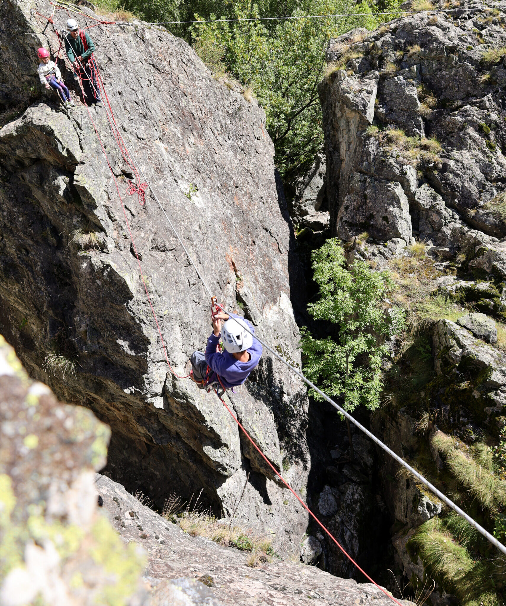 Découverte ludique en famille de l’évolution sur corde dans le chaos de bloc du site d'escalade des Balme, le long de la Romanche.